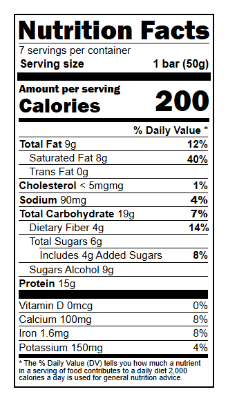 Ingredients: Protein blend (soy protein isolate, milk protein concentrate, acid casein, whey protein isolate, milk protein isolate, calcium caseinate), coconut, maltitol syrup, hydrolyzed gelatin (beef), sorbitol, palm kernel oil, invert sugar, sugar, glycerin, cocoa powder (processed with alkali), oligofructose (chicory root extract), natural and artificial flavors, fructooligosaccharide, water, unsweetened chocolate, soy lecithin, salt, sodium phosphate, tocopherols, sucralose (non-nutritive sweetener).