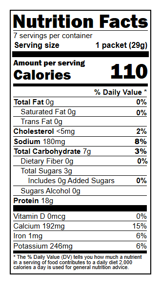 Ingredients: Soy crisps (soy protein isolate, rice flour, barley malt extract, salt), nonfat dried milk, milk protein concentrate, whey protein isolate, silicon dioxide, steviol glycosides (non-nutritive sweetener), sunflower lecithin