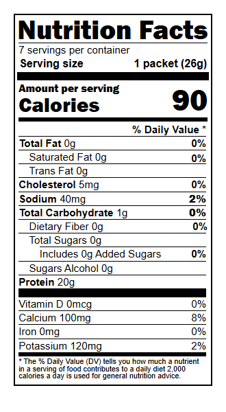 Ingredients: Whey protein isolate, malic acid, natural flavors, citric acid, contains 2 percent or less of sucralose (non-nutritive sweetener), beta-carotene (color), paprika (color), silicon dioxide, sunflower lecithin.