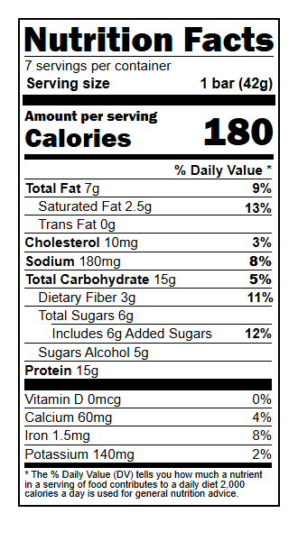 Ingredients: Protein blend (soy protein isolate, whey protein concentrate, milk protein concentrate, milk protein isolate, reduced mineral whey powder), invert sugar syrup, peanuts, glycerin, inulin, peanut butter, maltitol syrup, vegetable oil (palm kernel, palm, sunflower), sugar, partially defatted peanut flour, natural and artificial flavors, tapioca starch, brown rice syrup, chia oil, water, salt, soy lecithin, sorbitol, cream, tocopherols, nonfat dry milk, sodium phosphate, mono- and diglycerides, sucralose (non nutritive sweetener), carrageenan